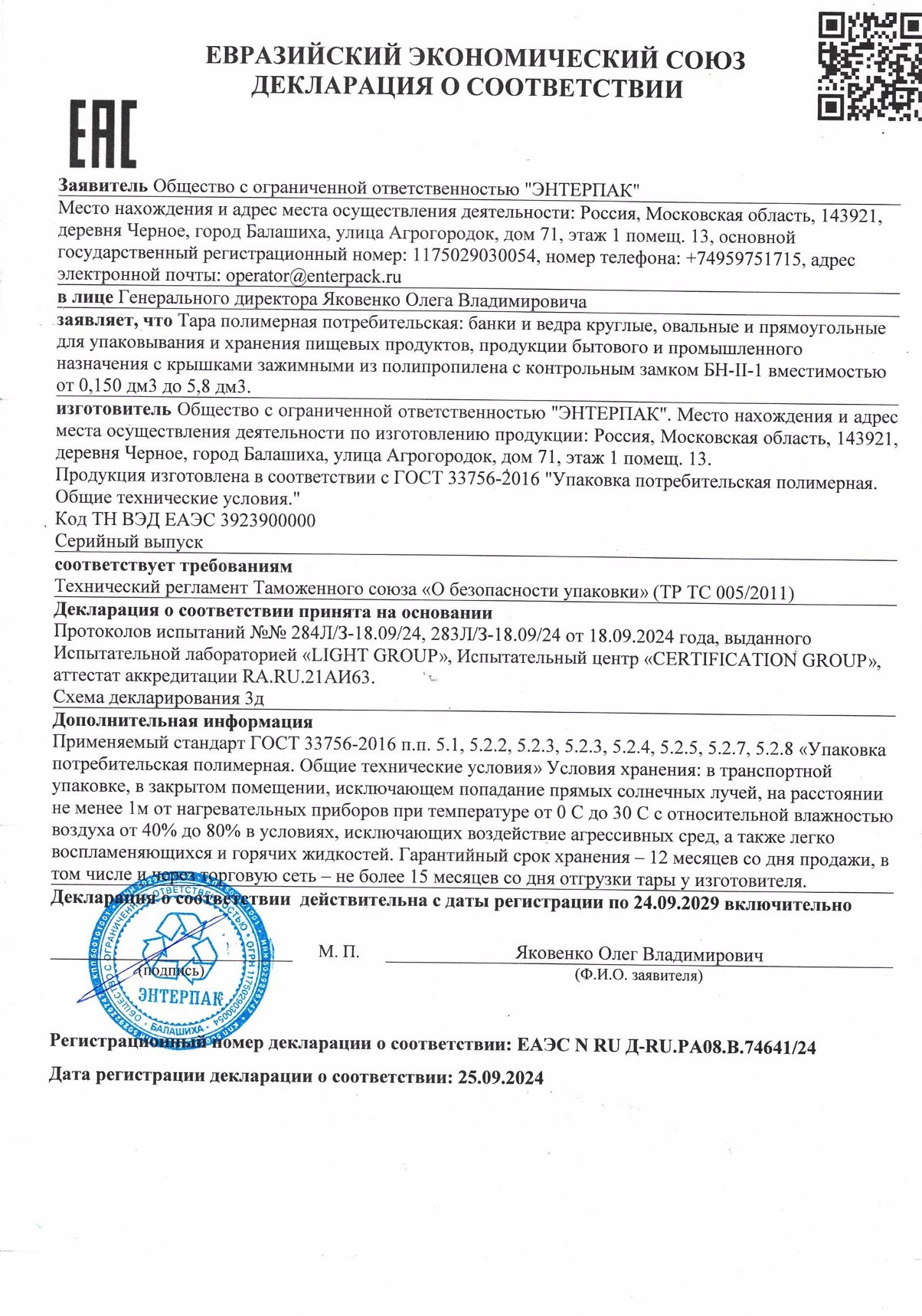 Декларация соответствия Технический регламент Таможенного союза «О безопасности упаковки» (ТР ТС 005/2011) Протокол испытания 283Л_З-18.09_24 Протокол испытания 284Л_З-18.09_24